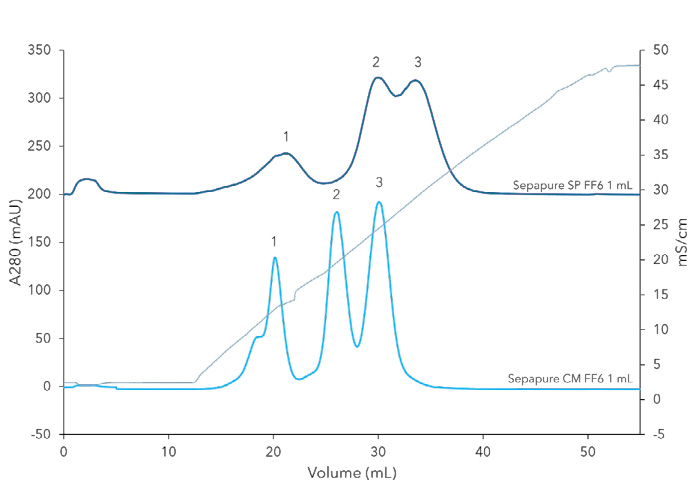 Один із найпоширеніших режимів FPLC – іонообмінна хроматографія, яка дає змогу розділяти білки за зарядом. На прикладі системи KNAUER AZURA® Bio та катіонообмінних колонок Sepapure® можна добре побачити, як цей принцип працює на практиці та як вибір сорбенту впливає на результат очищення.