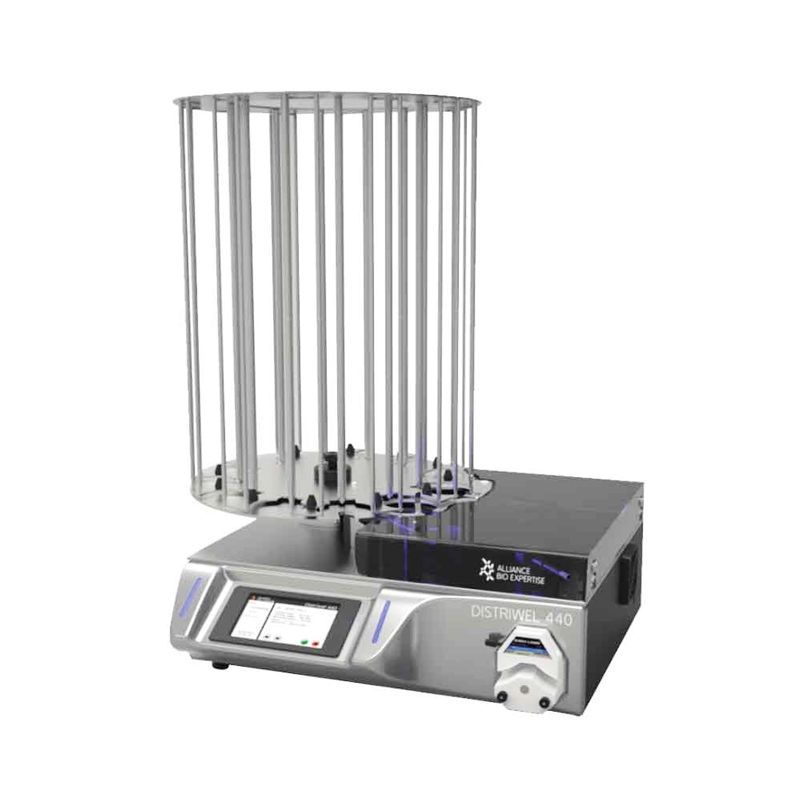 Distriwel 440 має захисну кришку з плексигласу та вбудовану УФ-лампу, що допомагає запобігти забрудненню під час процесу наповнення. Також важливо зазначити, що компактна основа, знімна карусель та знімна передавальна пластина значно спрощують використання й очищення пристрою.