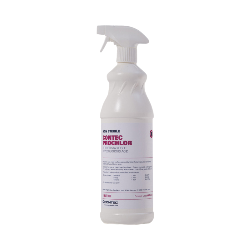 Contec ProChlor – революційний готовий до використання розчин, який забезпечує знищення спор на 100 % менш ніж за 60 секунд. Ефективний та безпечний спорицид нового покоління. Завдяки унікальній формулі на основі гіпохлоритної кислоти й очищеної води ефективний проти бактерій, грибків, плісняви, дріжджів, вірусів і спор.