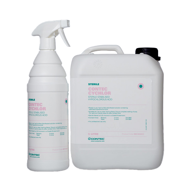 Contec CyChlor – готовий до використання дезінфекційний засіб на основі гіпохлоритної кислоти в очищеній воді. Розчин ефективний проти бактерій та дріжджів уже за 3 хвилини.